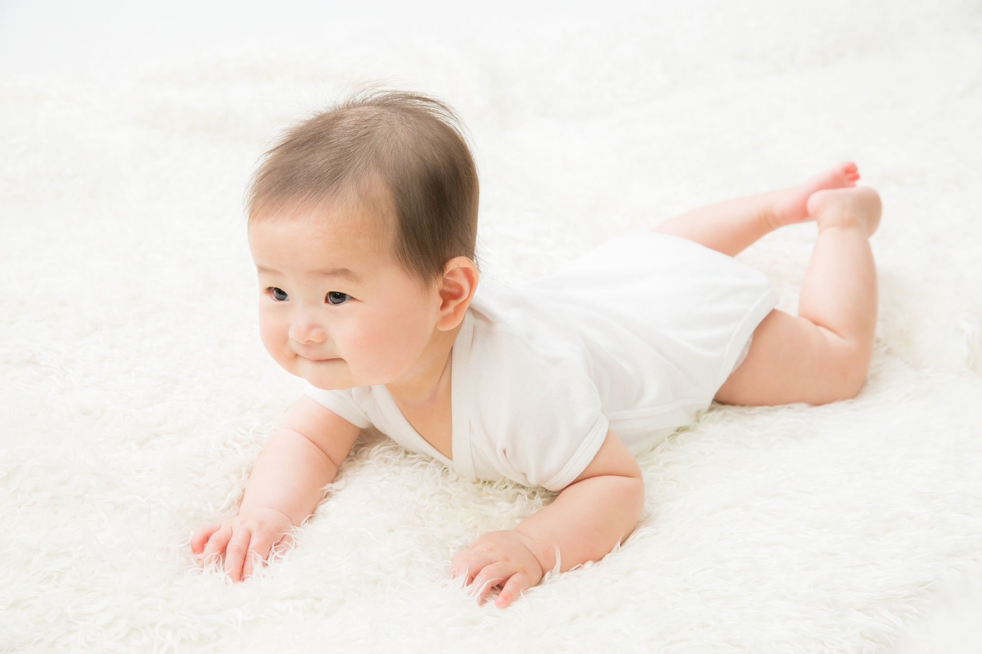 生後3~4か月ほど経つと、赤ちゃんの首がすわり、肘で体を支えながら頭を持ち上げた状態を保てるようになります。また、生後4か月ごろは、両手・両肘が床についていない状態で、腕と足を伸ばして顔を上げる、いわゆる「飛行機のポーズ」が見られるケースも増えます。ただし、上体を起こしながら腕を使っておもちゃなどを口に運ぶ動きはまだ難しいでしょう。